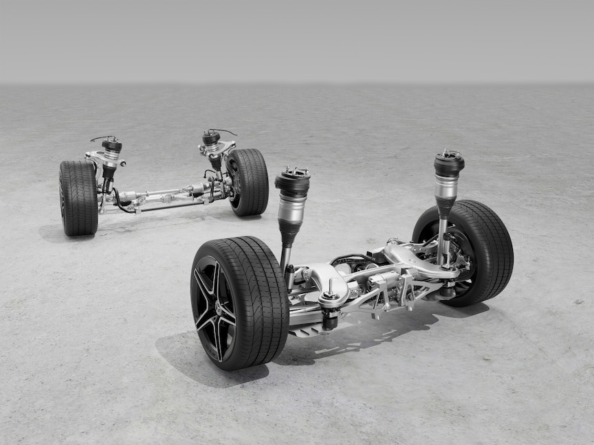 Az AIRMATIC több felfüggesztési rendszer előnyeit ötvözi magában – választhat a kényelem és a dinamika között. Az intelligens adaptív csillapító rendszer érzékenyen reagál az út-egyenetlenségekre. Minden keréknél külön-külön szabályozásra kerül a lengéscsillapító, és ez alapot ad a kiegyensúlyozott utazáshoz. A szintszabályozó rendszer igény szerint emeli vagy süllyeszti a járművet